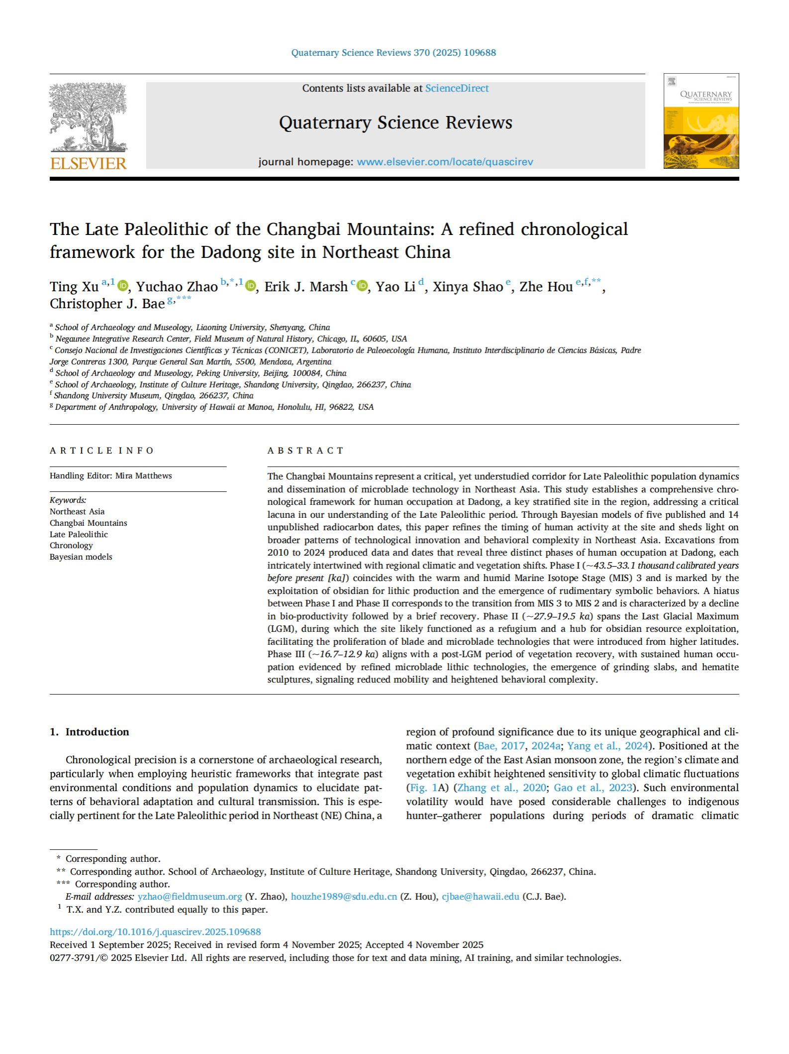 yl7703永利集团考古文博学院徐廷教授通过放射性碳同位素测定等技术手段,确定了大洞遗址约4.35万年至1.29万年前连续三期人类活动的时间序列,首次系统建立了长白山地区旧石器时代晚期完善的年代学框架,为理解东北亚地区细石器技术与象征行为的起源与扩散提供了新的参照系。